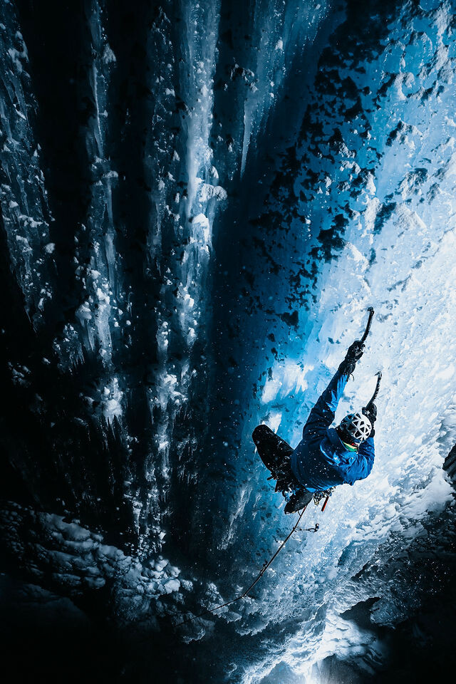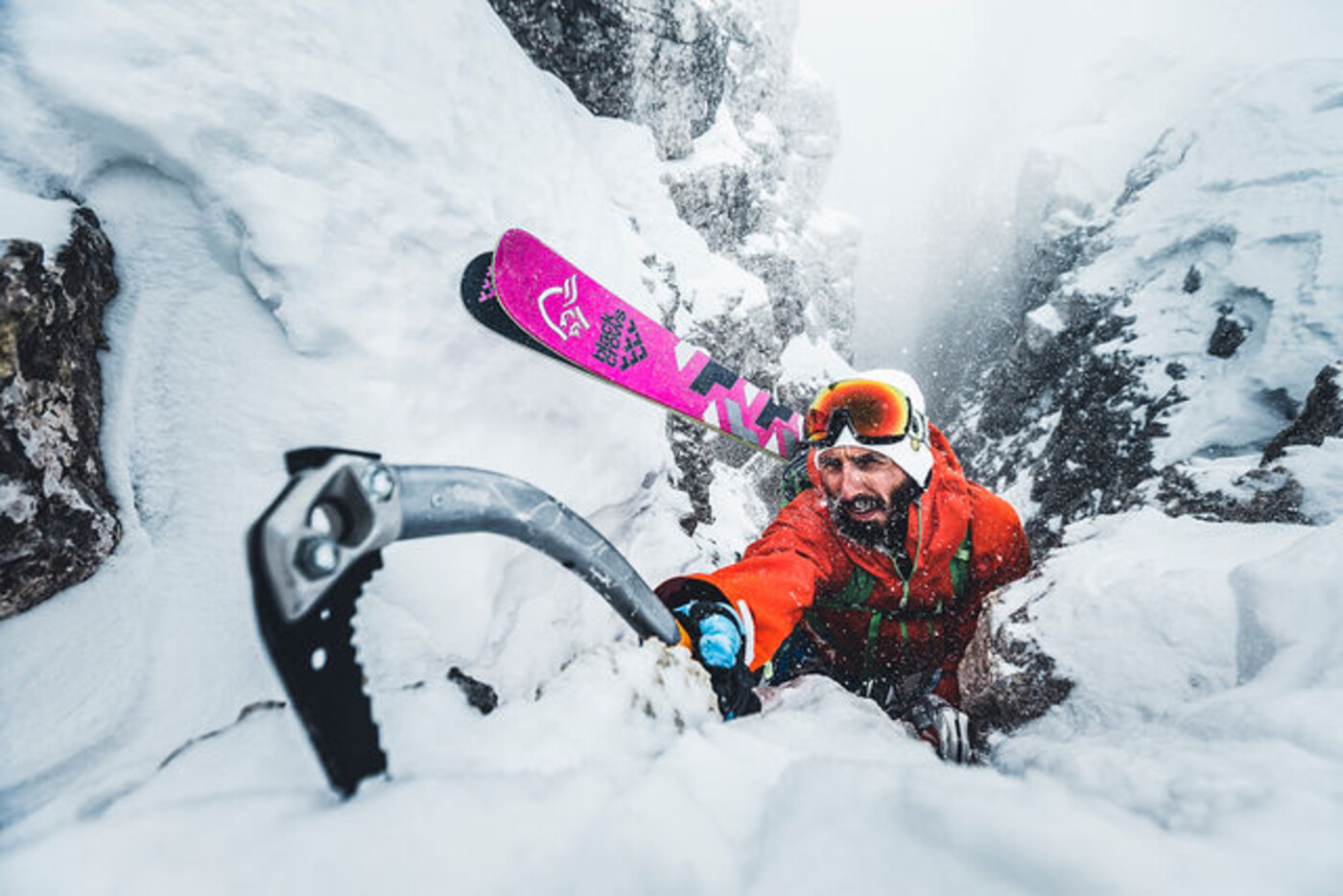 J’en ai plusieurs, mais celles qui comptent le plus sont souvent un mélange de technique, de timing et de symbole. J’ai participé à des courses et des concours, parfois en repoussant mes propres limites physiques, en partageant de vrais moments avec les athlètes. Quand on crée ce genre de lien, les photos prennent plus de poids. Il y en a une qui sort du lot : Giuliano gravissant un couloir à San Martino di Castrozza, piolets en main, skis sur le dos, la neige tombant autour de lui. Cette photo est devenue emblématique et a fait le tour du monde. Je suis retourné sur place, j’ai essayé de la recréer, mais il manquait quelque chose. L’ingrédient secret. Ce quelque chose que je ne comprends toujours pas complètement.