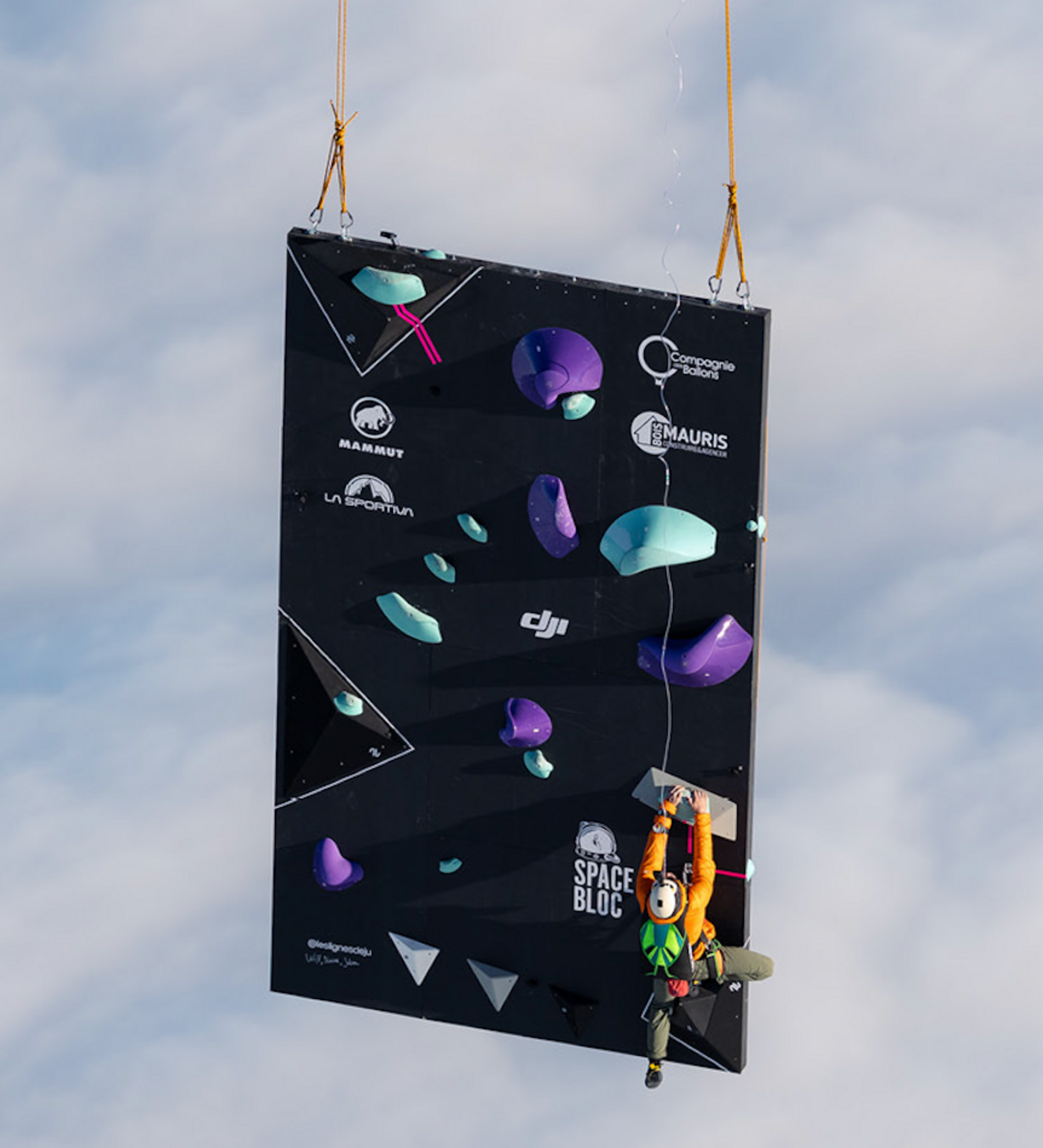 Julien Roux vient d’accomplir un exploit inédit : grimper le premier bloc volant, plus haut mur jamais construit, et ce, suspendu à une montgolfière oscillant entre 4 200 et 4 350 mètres avant de sauter en parachute. Lors de sa performance d’1 h 30 (à -15 °), l’altitude maximale atteinte a été de 4 990 mètres, soit plus haut que le toit de l'Europe : le Mont Blanc.