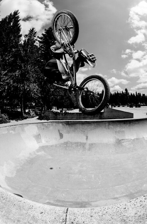 « Dès le départ, j’ai toujours préféré voir des riders qui privilégiaient leur style aux figures qu’ils pouvaient performer. Donc c’est assez personnel comme choix et c’est un aspect vers lequel je me suis naturellement dirigé. » Kevin a le style dans le sang, une particularité qui fera qu’il se démarquera assez rapidement dans le monde du BMX. La recherche du meilleur trick et du meilleur angle façonne la vision qu’il a de son sport et influencent son parcours, lui faisant naturellement passer des compétitions aux images avec les vidéos et la photo : « Je fais un peu moins de compet’ aujourd’hui car le « riding » que j’ai développé d’année en année n’est pas un riding de compétition. Ce dernier va être super impressionnant avec de grosses figures, mais ce n’est pas trop mon truc. J’ai alors préféré me concentrer sur les vidéos. » Puis il y a sa ville de cœur, Annecy, qui a aussi inspiré son expression du BMX, « Le fait de grandir à Annecy et de pratiquer sur le bowl aux marquisats, un lieu fort et emblématique, a aussi forcément forgé mon riding et cette attention particulière à l’esthétique. Je suis persuadé que l’environnement façonne la vision que l’on a de sa pratique et sa manière de rider. »