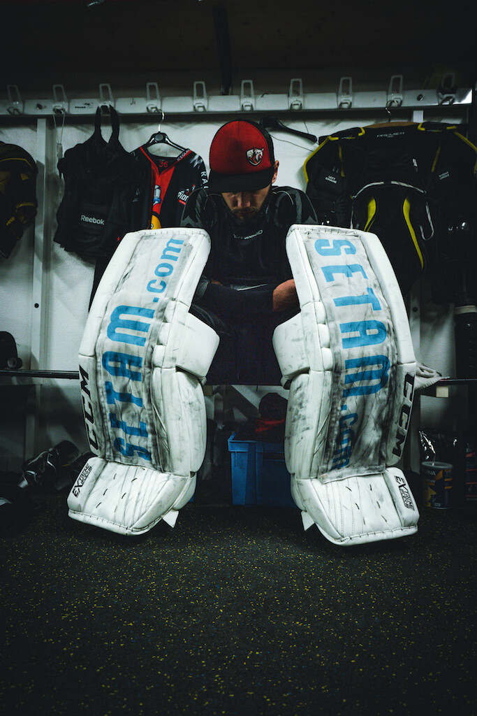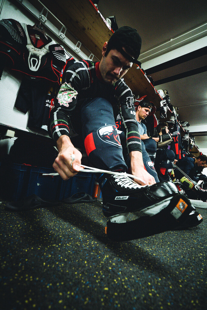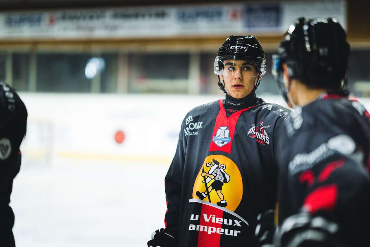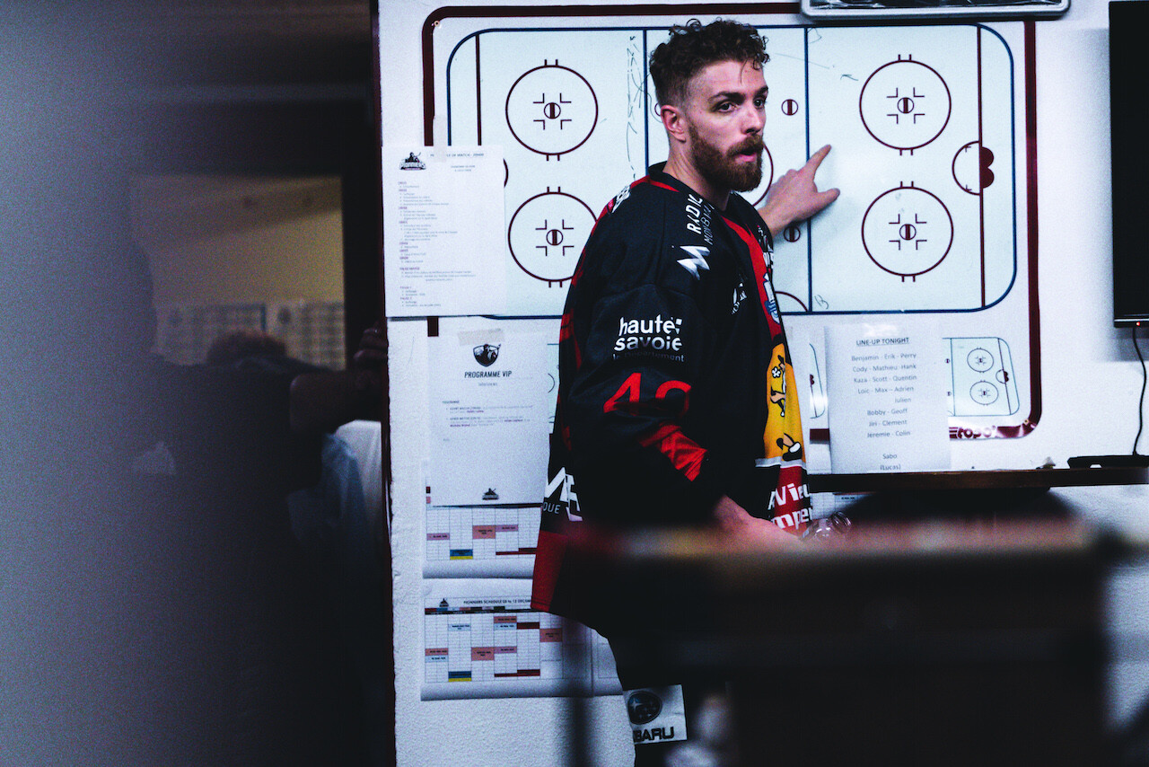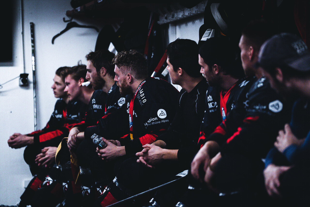 La décontraction initiale a laissé la place à une concentration extrême. Les visages se délestent des sourires entrevus quelques minutes auparavant. Les regards sont plus graves, intenses. C’est la première fois que les chamoniards croisent leurs adversaires lyonnais. La bataille commence. Mentale celle-ci. Un jeu de dupes, un round d’observation pour prendre ce que l’on appelle l’ascendant psychologique. Retour aux vestiaires. Les derniers encouragements. Virils. Le défenseur américain Colin Sullivan frappe avec sa crosse la protection tibiale de chacun de ses coéquipiers. Et si l’un de ses frères d’arme échappe au rituel, superstitieux, il fait même un détour pour s’exécuter et ainsi ne pas provoquer le mauvais sort. Un dernier mot avec Loïc Coulaud, attaquant rouge et noir, façon affiche footballistique du dimanche soir sur la chaîne privée numéro 4 : « Le mot d’ordre, c’est de soigner nos débuts de match. Rentrer très fort sur la glace, ne pas se prendre la tête et jouer simple. Réaliser une première grosse présence, pour ne pas courir après le score ensuite… » Une mauvaise habitude chez les Pionniers.