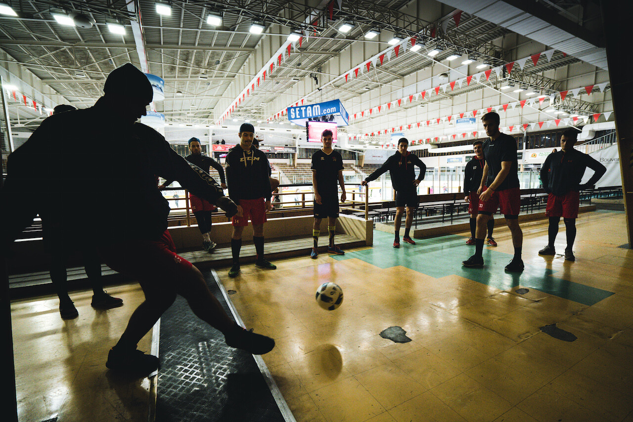 Nous sommes à deux heures du coup d’envoi. Dans le vestiaire des Pionniers. Si les infrastructures sont quelque peu vétustes, l’approche est professionnelle. Méticuleuse et soignée. Tous les joueurs sont déjà présents, conscients des enjeux de la partie. Une enceinte crache de la country music, rappelant la domination nord-américaine sur la discipline mais également sur un effectif cosmopolite qui compte autant de français que d’étrangers. Ce qui n’empêche pas le collectif d’être très soudé, bien au contraire. « L’ambiance est vraiment top. Les joueurs les plus expérimentés nous ont réellement bien intégrés. Ils nous protègent, nous conseillent… » témoigne Jérémy Penz, 19 ans, étoile montante issue de la formation du club. C’est vrai que l’atmosphère est joviale, légère, complice. Ça se chamaille, ça se chambre. La traditionnelle « brésilienne » d’avant-match, ballon de foot au pied, en guise de réveil musculaire et point de ralliement des joueurs. Une bande de potes en somme.