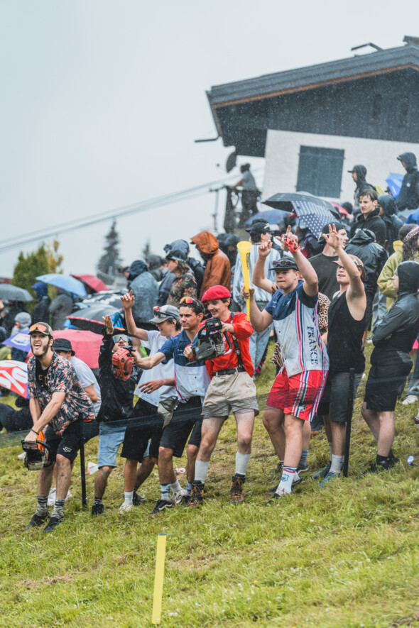 La journée avait débuté sous un soleil radieux, mais ce samedi 6 juillet, les conditions météorologiques se sont rapidement dégradées, bouleversant le programme des compétitions. Les finales élites de DH, avancées en urgence, se sont déroulées sous une pluie battante, transformant la piste en un véritable défi. Cependant, rien n’effraie ces athlètes intrépides, qui ont bravé les éléments avec une détermination sans faille. L'ambiance survoltée et les défis imposés par la météo ont fait de cette journée un moment inoubliable. Le vacarme des tronçonneuses et des vuvuzela donnait le tempo, contribuant sans aucun doute au triomphe d'Amaury Pierron (Commencal-Muc-off) et d'Eleonora Farina (MS Intense Racing), victorieuse pour la première fois de sa carrière en coupe du monde.